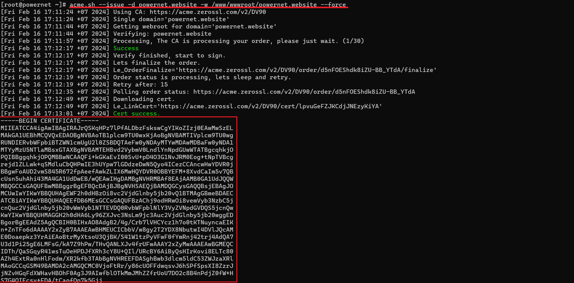 1 | acme.sh --issue -d powernet.website -w /www/wwwroot/powernet.website --force |