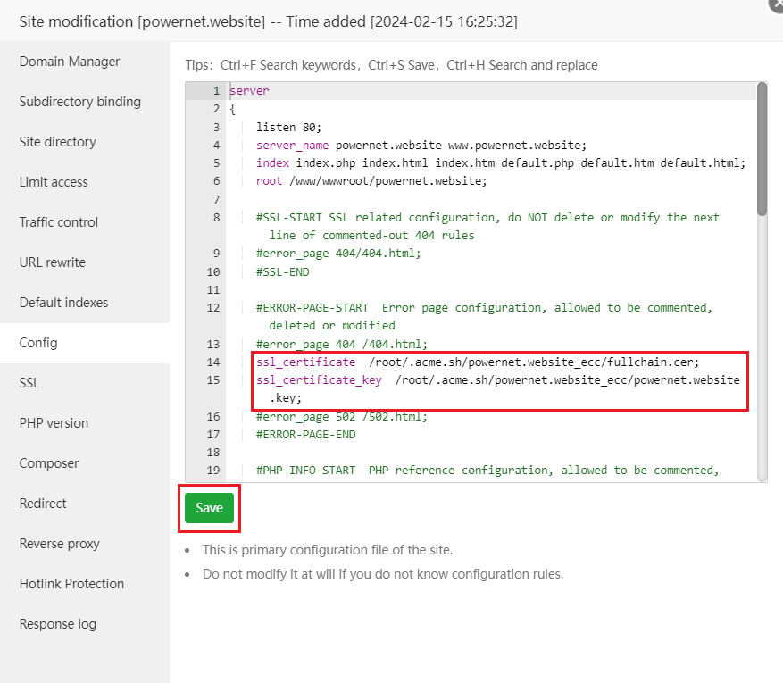 Để cấu hình chứng chỉ lên Website, bạn hãy vào AAPANEL mở Website cần cài. Sau đó click vào Config và bạn copy đường dẫn 2 File là fullchain.cer và domain.key thay vào đường dẫn cũ và thực hiện Save lại để áp dụng thay đổi.
