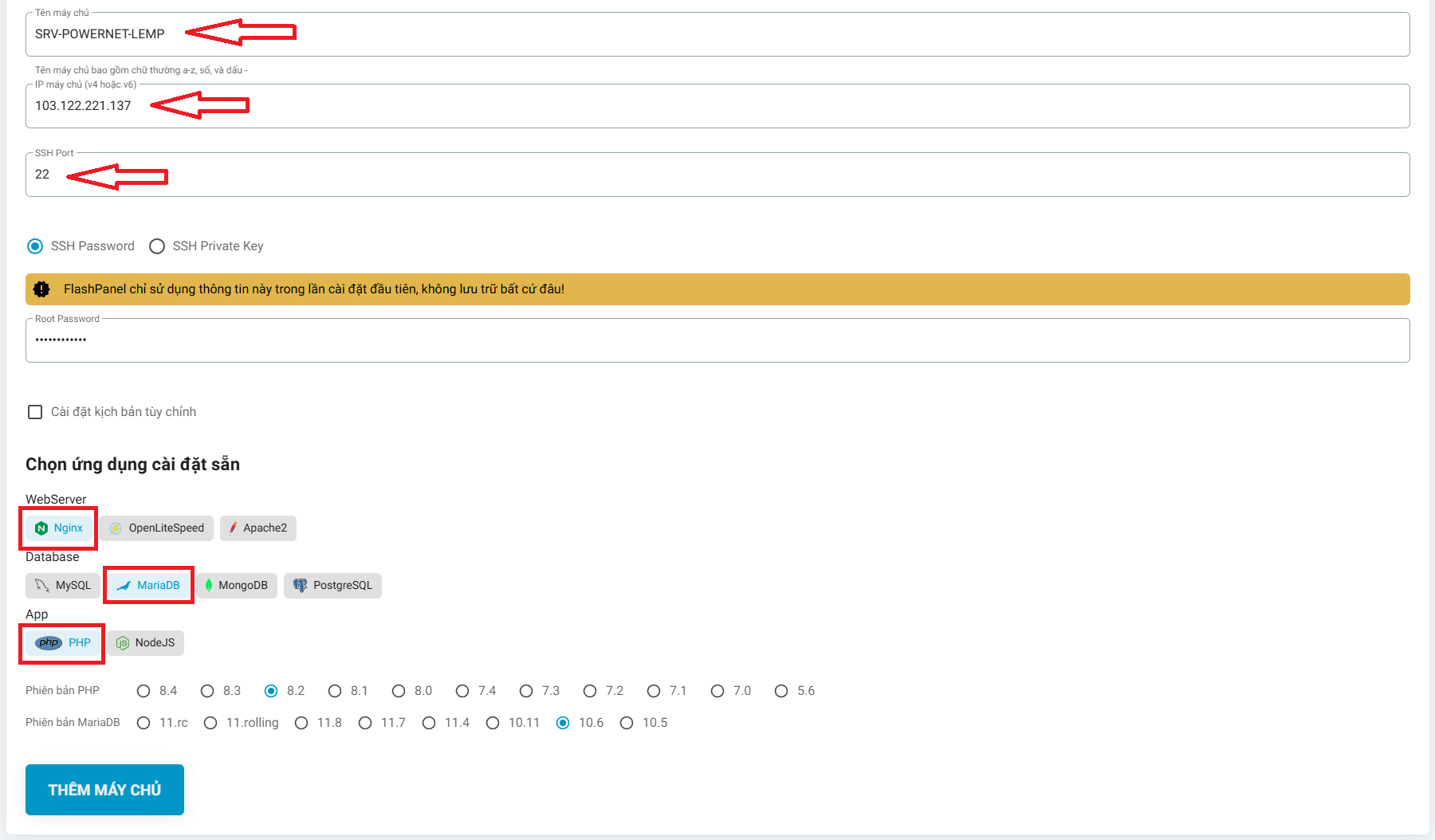 Sau đó bạn nhấn vào nút THÊM MÁY CHỦ (ADD SERVER) để FlashPanel tiến hành kết nối đến máy chủ Linux của bạn và cài đặt các ứng dụng cần thiết