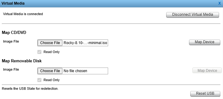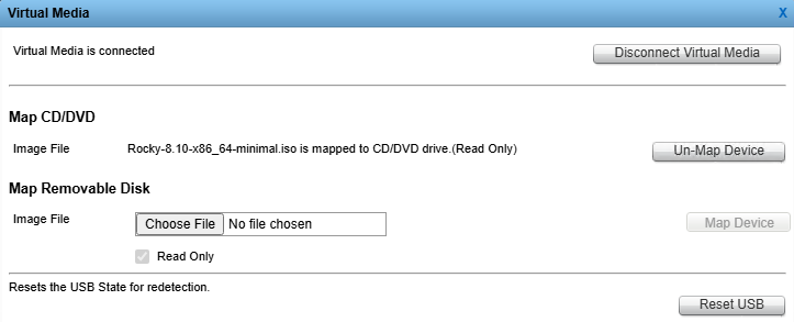 Bước 4: Trong giao diện Virtual Console, Nhấn vào Virtual Media > Nhấn vào Connect Virtual Media > Nhấn vào Chọn tệp để trỏ đến file ISO RockyLinux 8 bạn đã tải trước đó > Map Device