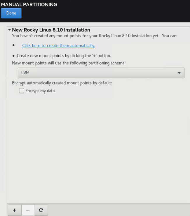 Bước 13: Nhấn vào dấu + để tạo Partition. Đối với máy chủ vật lý và cài đặt RockyLinux, thường bạn chỉ cần cài đặt 3 phân vùng là /boot (1GB) và / (root – phân vùng chứa dữ liệu của Linux) và SWAP