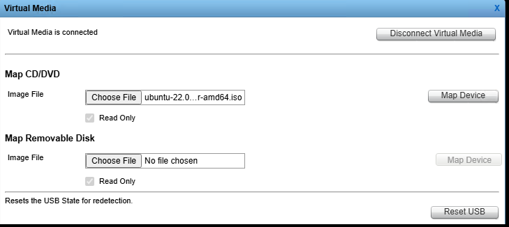 Bước 4: Trong giao diện Virtual Console, Nhấn vào Virtual Media > Nhấn vào Connect Virtual Media > Nhấn vào Chọn tệp để trỏ đến file ISO Ubuntu Server 22.04.5 LTS bạn đã tải trước đó > Map Device