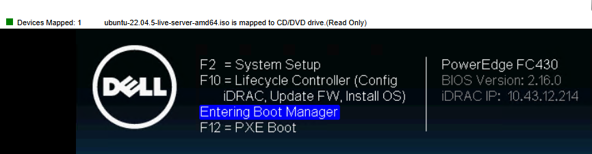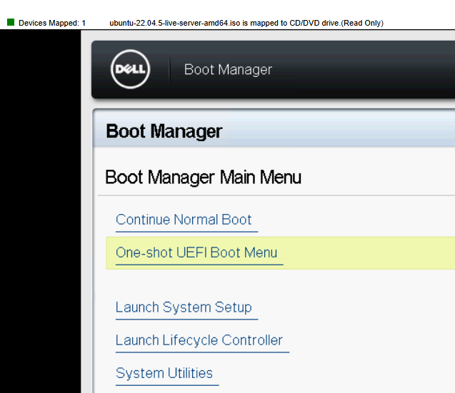Bước 6: Sau khi đã Mount xong File ISO Ubuntu Server 22.04.5 LTS và khởi động máy chủ thì nhấn F11 để vào Boot Manager