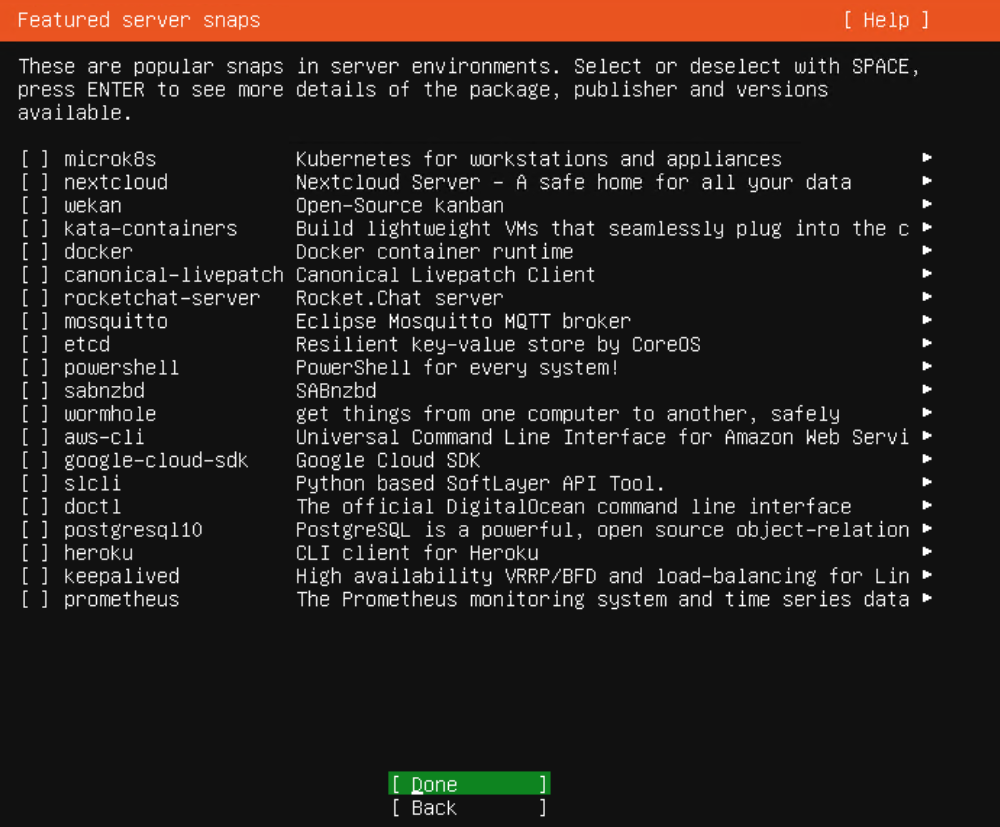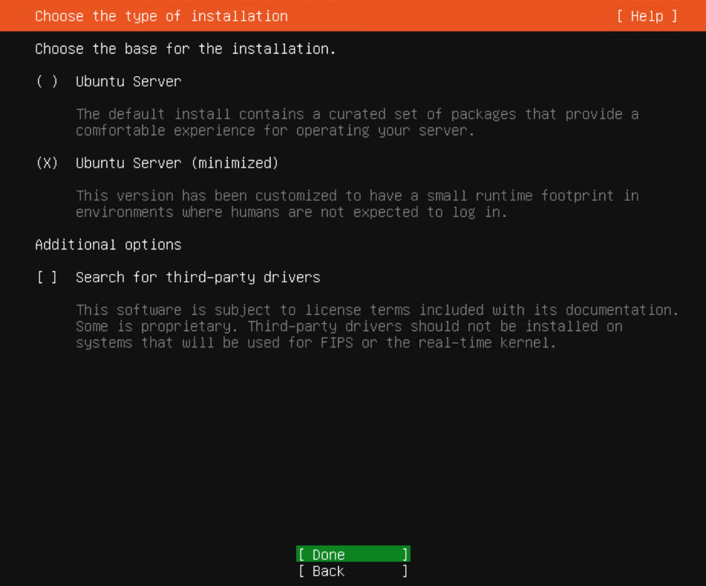 Bước 12: Lựa chọn kiểu cài đặt cơ bản cho hệ điều hành Ubuntu Server, ở đây nếu bạn nên chọn Ubuntu Server (minimized) nếu bạn muốn tối ưu về tài nguyên sử dụng > Done