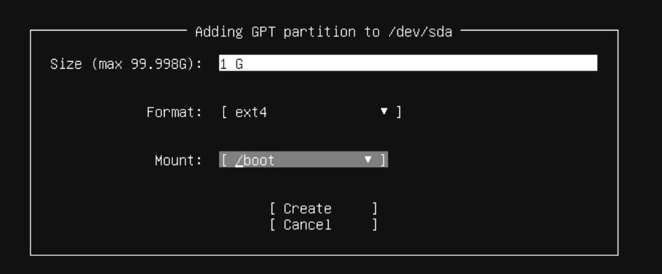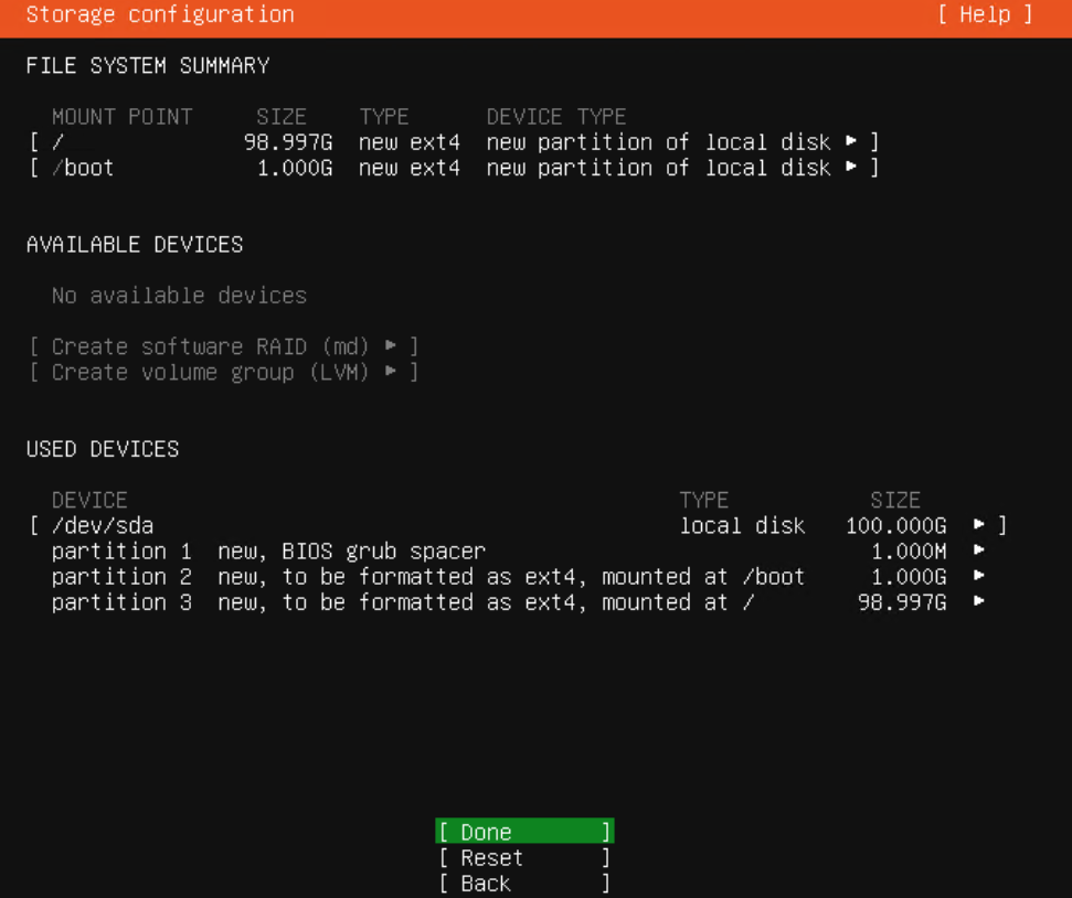 Bước 16: Đối với máy chủ vật lý và cài đặt Linux Server, thường bạn chỉ cần cài đặt 2 phân vùng là /boot (1GB) và / (root – phân vùng chứa dữ liệu của Linux) > Done > Continue