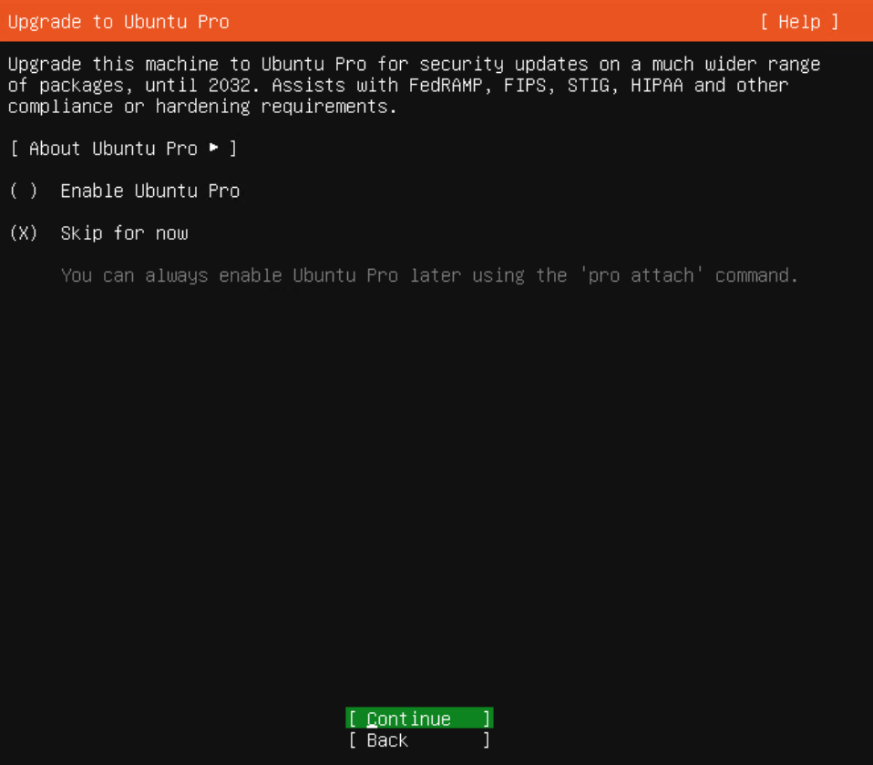 Bước 18: Chọn Skip for now nếu bạn không có nhu cầu nâng lên bản trả phí (Pro) của Ubuntu > Continue
