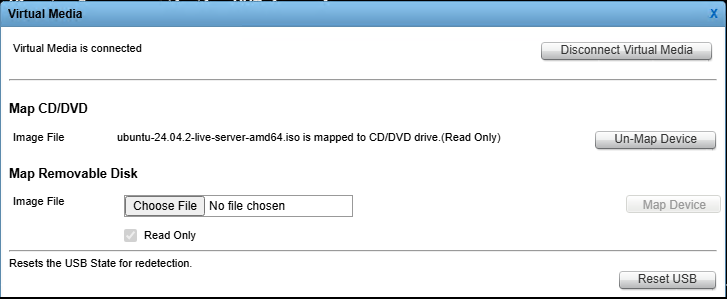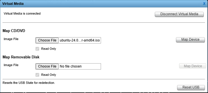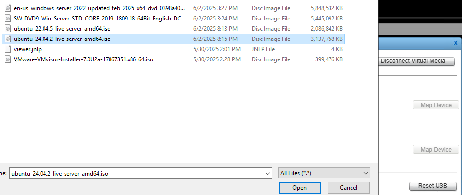 Bước 4: Trong giao diện Virtual Console, Nhấn vào Virtual Media > Nhấn vào Connect Virtual Media > Nhấn vào Chọn tệp để trỏ đến file ISO Ubuntu Server 24.04.2 LTS bạn đã tải trước đó > Map Device