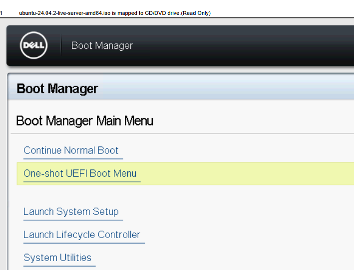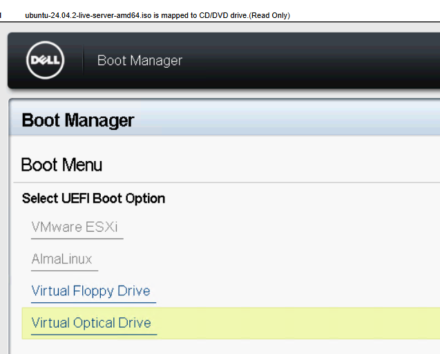 Bước 6: Sau khi đã Mount xong File ISO Ubuntu Server 24.04.2 LTS và khởi động máy chủ thì nhấn F11 để vào Boot Manager