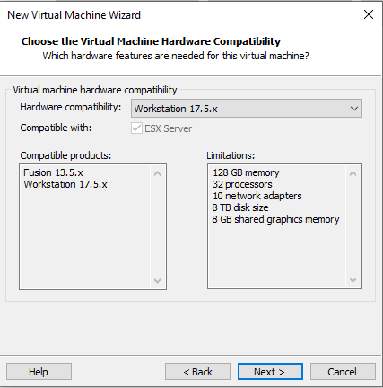Bước 4: Tại mục Hardware compatibility chọn Workstation 17.5.x > Nhấn Next