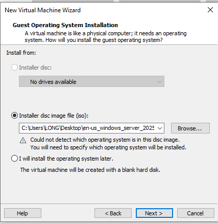 Bước 5: Tại mục Installer disc image file (.iso) nhấn Browse để trỏ đến nơi lưu file ISO Windows Server 2025 > Nhấn Next