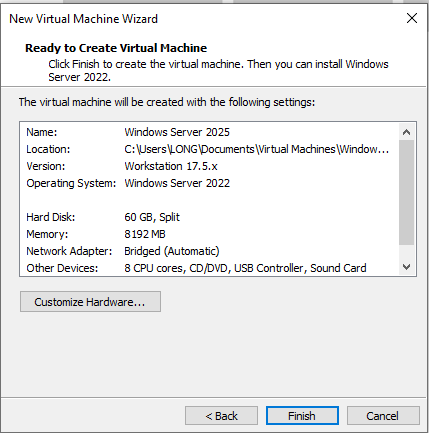 Bước 14: Nhấn Finish hoàn thành cấu hình Templete máy ảo Windwos Server 2025