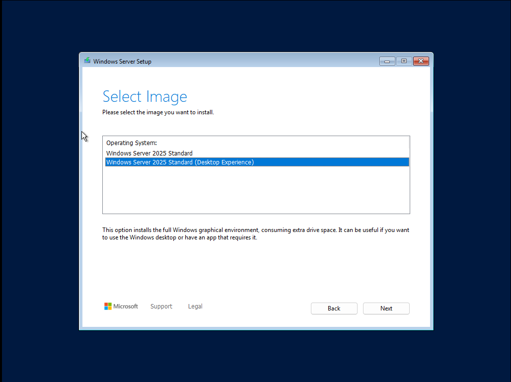 Bước 20: Chọn bản Windows Server 2025 Standard (Desktop Experience) để cài đặt bản Windows có giao diện > Nhấn Next