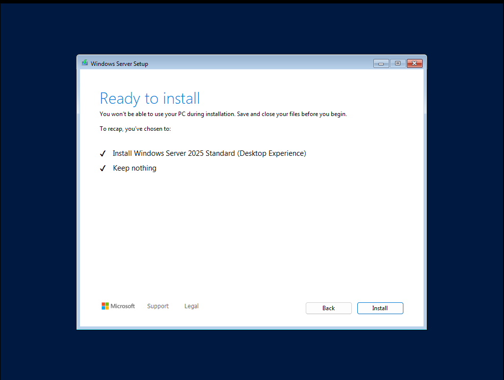 Bước 18: Chọn mục Install Windows Server và tích chọn I agree everything will be deleted including files, apps, and settings > Nhấn Next