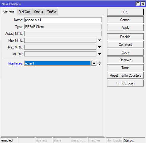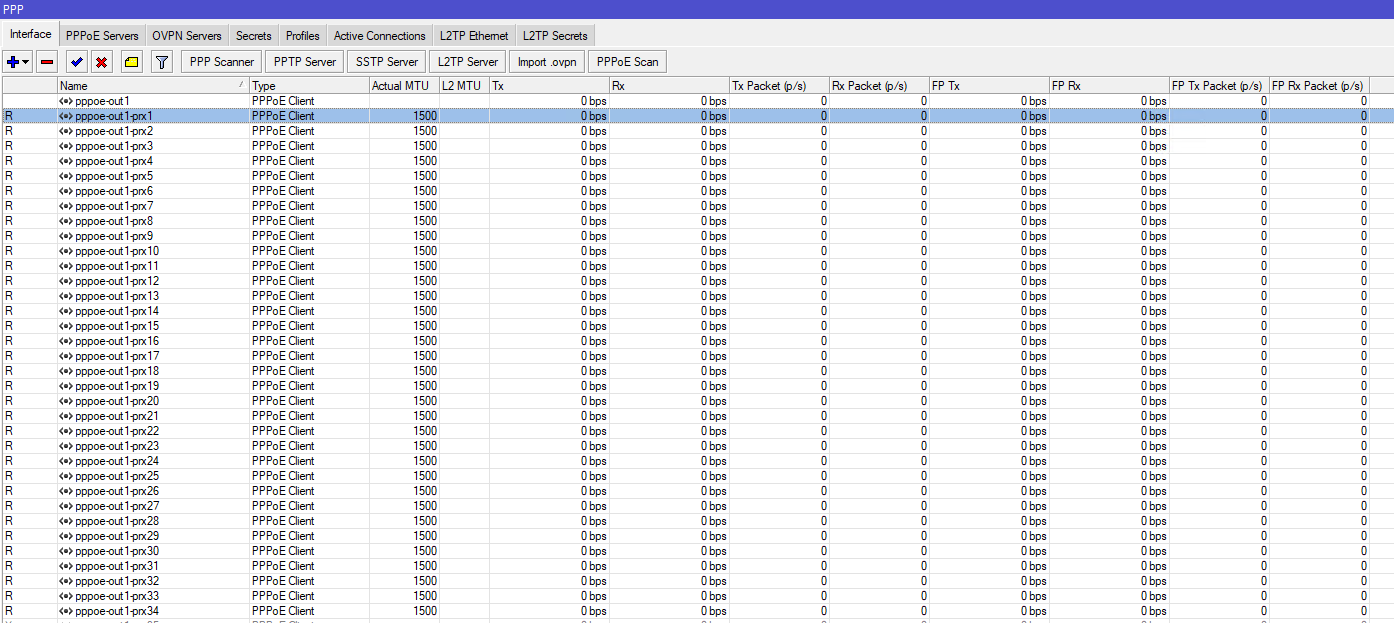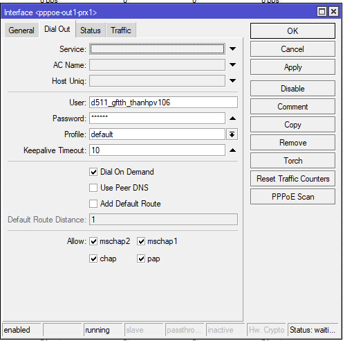 Sau khi chạy lệnh cập nhật tài khoản PPPoE xong, bạn vào mục PPP, nhấn vào bất kỳ 1 phiên PPPoE từ 01 – 34, chuyển qua Tab Dial Out để kiểm tra xem đã cập nhật User/Pass PPPoE hay chưa. Cuối cùng bạn thực hiện Enable các phiên PPPoE đã cập nhật User/Pass PPPoE