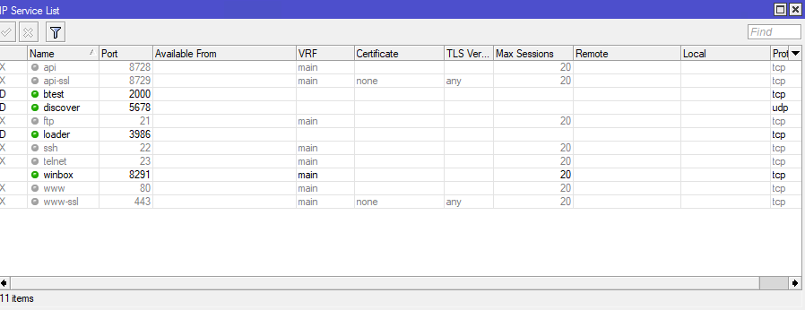 Bạn vào mục IP > Service và tắt các dịch vụ không cần thiết, bạn có thể tắt hết và để lại mỗi dịch vụ Winbox là được