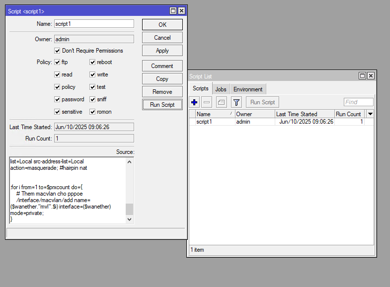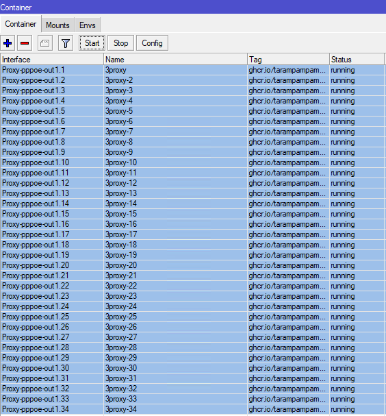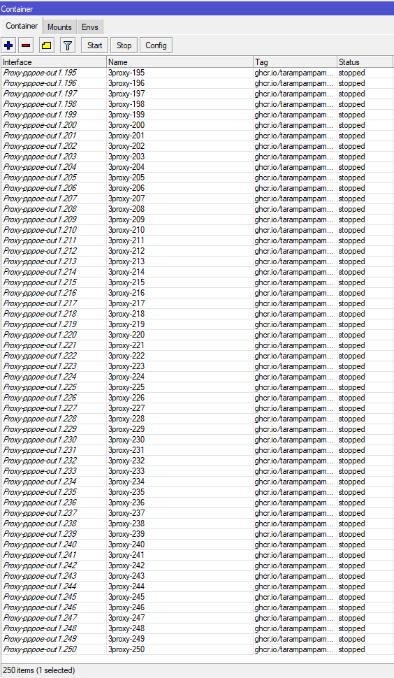 1 2 | :for i from=1 to=250 do={/container/envs/add name=("Prx-pppoe-out1-envs".$i) key=PROXY_LOGIN value=powernet} :for i from=1 to=250 do={/container/envs/add name=("Prx-pppoe-out1-envs".$i) key=PROXY_PASSWORD value=PowerNet@2025} |
