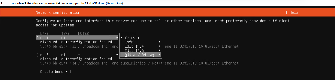 Bước 2: Tại bước khai báo cấu hình IP cho card mạng, bạn chọn cổng mạng muốn cấu hình VLAN và chọn Add a VLAN tag