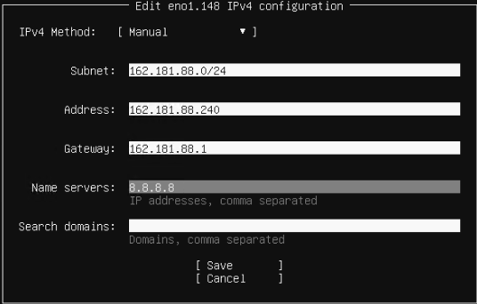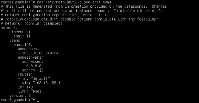 1 2 3 4 5 6 7 8 9 10 11 12 13 14 15 16 17 | network: ethernets: eno1: {} vlans: eno1.148: addresses: - 162.181.88.240/24 nameservers: addresses: - 8.8.8.8 search: [] routes: - to: "default" via: "162.181.88.1" id: 148 link: "eno1" version: 2 |