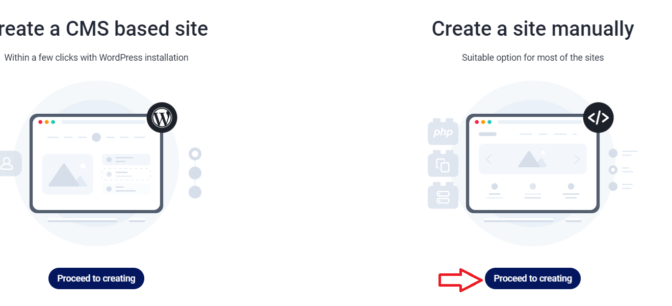 Vì bài hướng dẫn với nội dung thêm tên miền vào FastPanel nên tôi sẽ chọn Create a site manually: Chỉ thêm tên miền
