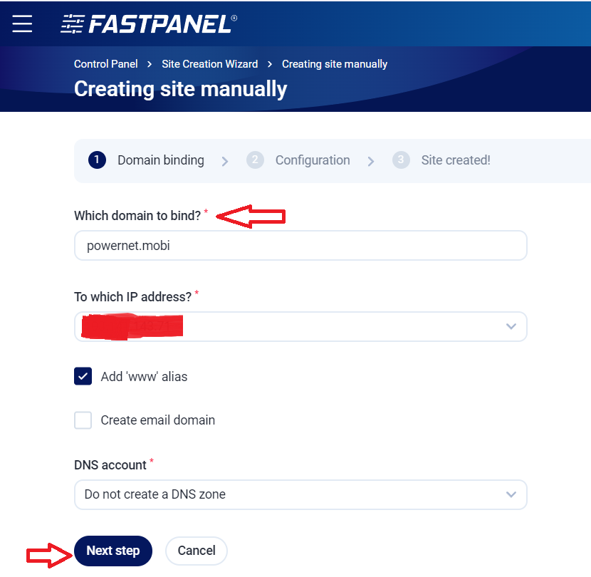 Sau đó bạn nhập tên miền cần thêm ở Which domain to bind? và chọn Next step