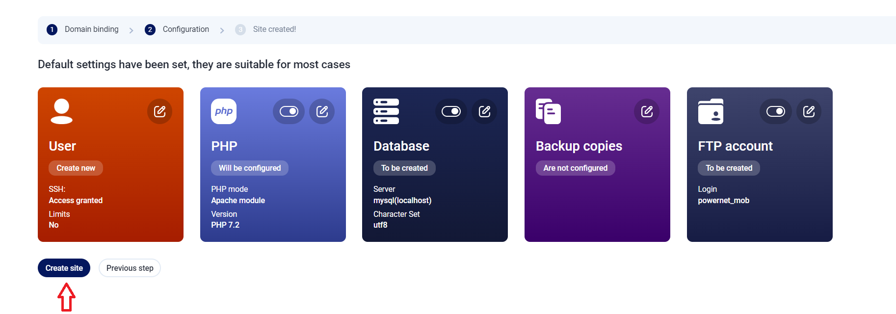 Đồng thời lúc này FastPanel cũng sẽ tạo tương ứng cho bạn các thông tin đi kèm bao gồm: